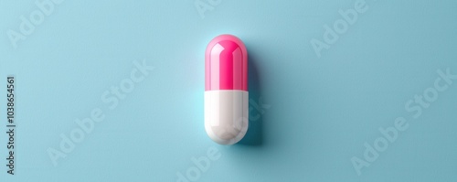 A vibrant pink and white capsule rests on a soft blue surface symbolizing health and pharmaceuticals