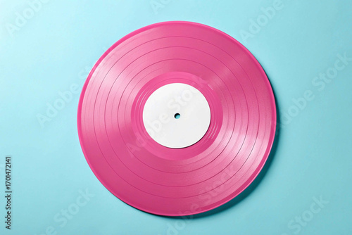 A vibrant pink vinyl record lies centered on a clean, light blue background.