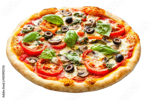 A vibrant pizza with tomatoes mushrooms olives and basil on a crispy golden crust isolated on black