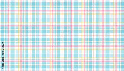 A vibrant plaid pattern featuring intersecting lines of various colors, including light blue, pink, yellow, and white, creating a cheerful textile appearance