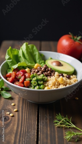 A vibrant plant-based dish composed of quinoa avocado greens and legumes on a rustic wood table