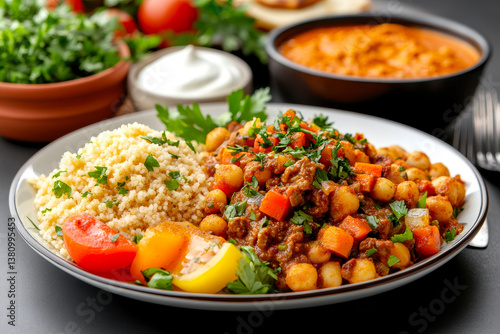 A vibrant plate featuring couscous, spiced chickpeas with vegetables, and fresh herbs, accompanied by yogurt and a rich stew in the background.