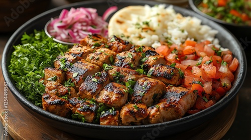 A vibrant plated dish featuring grilled meat skewers, fresh vegetables, aromatic herbs, rice, and sides, perfect for showcasing delicious culinary experiences.