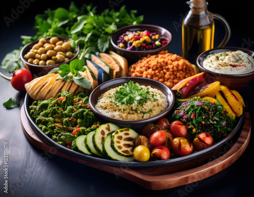 A vibrant platter filled with falafel, hummus, vegetables, pita bread, and an array of Middle Eastern delights