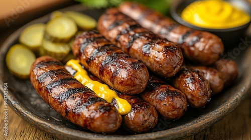 A vibrant platter of grilled sausages with mustard and pickles on the side, grilled sausages, pub food