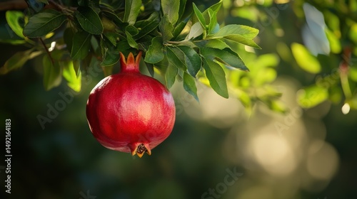 A Vibrant Pomegranate Hanging on a Lush Green Branch, Bathed in Sunlight A Stunning Display of Nature's Beauty
