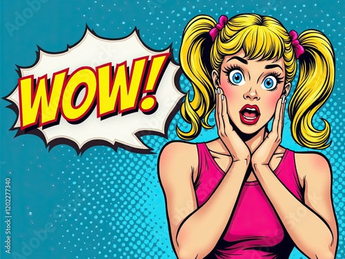 A vibrant pop art illustration of a woman with blonde hair, wearing a red dress, expressing shock speech bubble