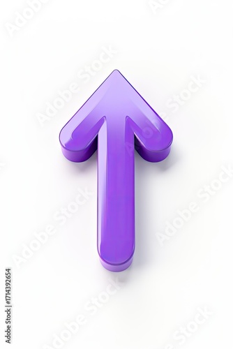 A vibrant purple, three-dimensional arrow pointing upwards, set against a stark white background, exhibits a glossy, smooth texture