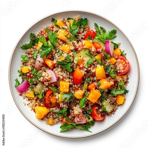 A vibrant quinoa salad filled with fresh vegetables, herbs, and colorful ingredients, perfect for healthy meals and gatherings.