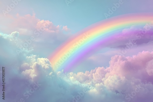 A vibrant rainbow arches gracefully above soft, pastel-colored clouds in a serene, dreamy sky