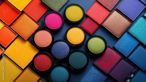 A vibrant rainbow of eyeshadow hues, arranged in a geometric pattern on a backdrop of bold, geometric shapes, ready to transform your look.