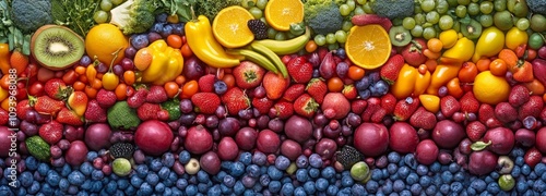 A vibrant rainbow of fresh fruits and vegetables, arranged in a colorful and delicious display.