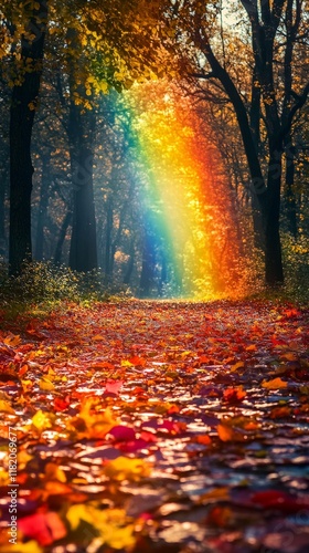 A vibrant rainbow shining over a park with scattered autumn leaves, representing the magical beauty of nature and positivity.