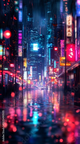 A vibrant, rainy city street illuminated by colorful neon lights and reflections.