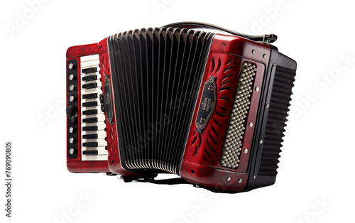 A vibrant red accordion positioned elegantly on a pristine white backdrop