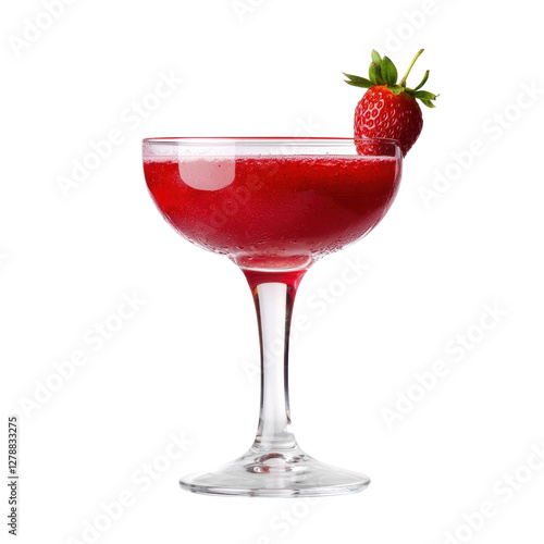 A vibrant red cocktail garnished with a fresh strawberry, served in an elegant glass. isolated on white background.