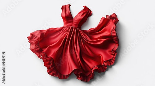 A vibrant red dress displayed elegantly, showcasing its flowing fabric and design.