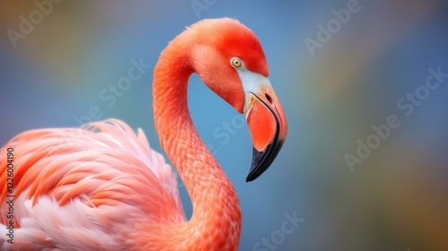 A vibrant red flamingo stands gracefully in nature, with a soft focus backdrop enhancing its stunning beauty.