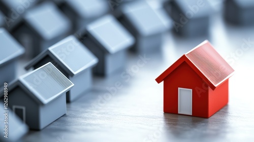 A vibrant red house stands out among gray miniature houses, symbolizing uniqueness in real estate or homeownership.