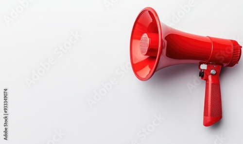 A vibrant red megaphone on a clean white background, symbolizing communication, announcement, and public speaking.