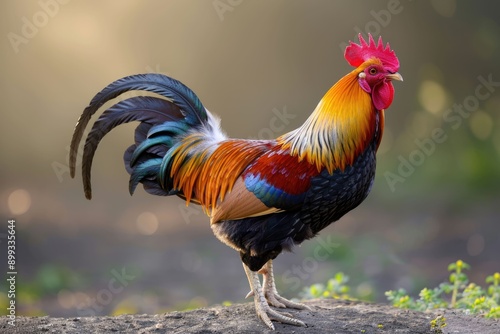 A vibrant red rooster stands in the sunlight showcasing its striking plumage and proud stance.