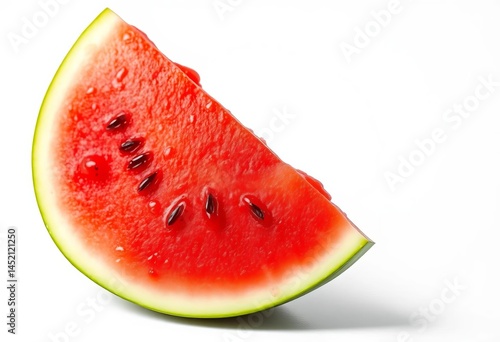 A vibrant red watermelon wedge, glistening with juice, sits on a pristine white background , summertime, macro