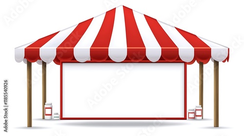 A vibrant red-and-white striped sales tent, blank storefront sign on top framed by poles, table with scattered products on display, cartoonish illustration style with vivid colors