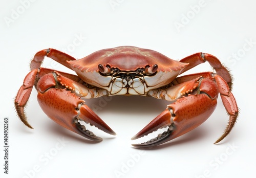 A vibrant, reddish-brown crab faces forward, claws extended, against a neutral backdrop. Detailed and striking