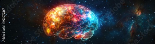 A vibrant representation of a brain illuminated by cosmic colors, symbolizing creativity, intelligence, and the universe's mysteries.