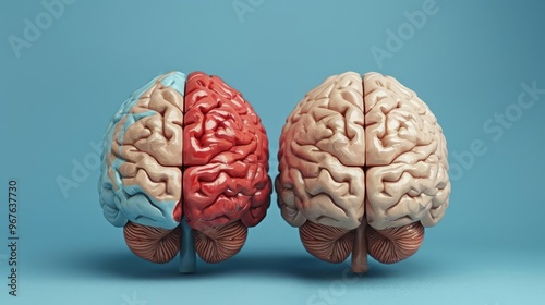 A vibrant representation of a human brain split into blue and red hemispheres, showcasing intricate textures and symbolizing creativity and emotion, ideal for educational or mental health themes.
