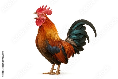 A vibrant rooster stands proudly against a pristine white background, its feathers a striking mix of orange, blue, and black, embodying the spirit of nature's artistry