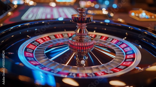 A vibrant roulette wheel spins in a casino, displaying vivid red and black colors, capturing the excitement of gambling.