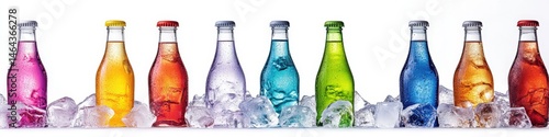 A vibrant row of colorful bottles of soda is sitting on ice now