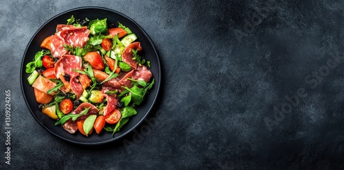 A vibrant salad topped with fresh greens, tomatoes, and slices of meat, presented in a black bowl against a dark background.