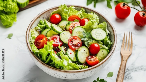 A vibrant salad with butterhead, tomatoes, cucumber, olive oil, and herbs awaits your enjoyment.