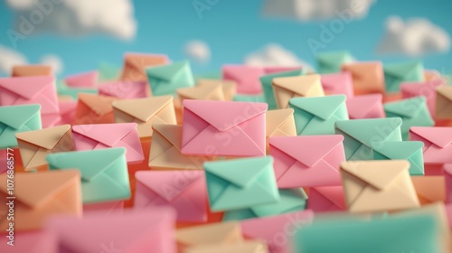 A vibrant scene featuring colorful envelopes scattered across a blue sky, creating a whimsical, cheerful atmosphere.