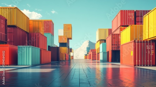 A vibrant scene of stacked shipping containers in various colors, creating a striking industrial landscape under a clear blue sky.
