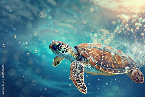 A vibrant sea turtle swimming underwater with bubbles and sunlight streaming through the water.