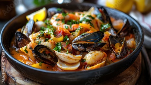 A vibrant seafood dish featuring mussels, shrimp, and herbs in a rich sauce.