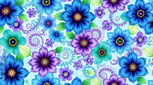 A vibrant seamless pattern featuring a kaleidoscope of jewel-toned flowers and intricate paisley designs, rendered in a watercolor style with a soft focus effect, showcasing a harmonio.