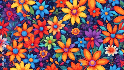 A vibrant seamless pattern of colorful flowers on a dark background.