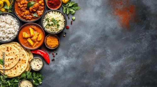 A vibrant selection of Indian curries, rotis, and rice, top view with plenty of copy space.