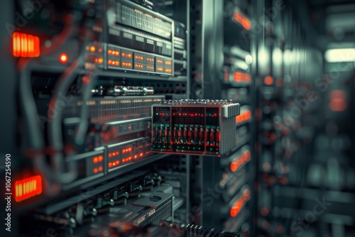 A vibrant server room brimming with glowing servers and clusters of blinking lights conveying cutting-edge technology and digital connectivity.