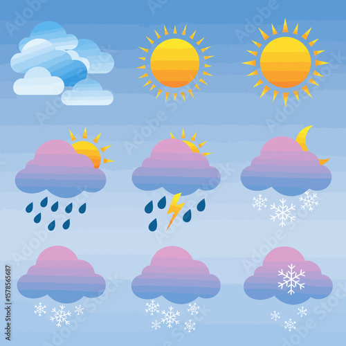 A vibrant set of weather icons showcases various atmospheric conditions, including sunny skies, rain, thunderstorms, and snow, set against a bright blue backdrop.