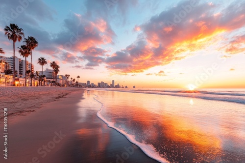 A vibrant shot of Tel Aviv skyline at sunset, with the city modern architecture and the sea in the background