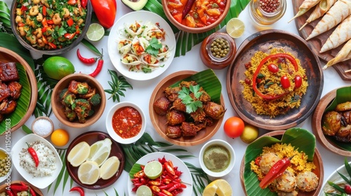 A vibrant showcase of food on white, featuring exotic dishes plated artistically,