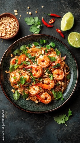 A vibrant shrimp dish garnished with herbs, nuts, and lime, served on a dark plate.