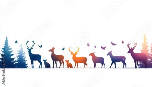 A vibrant silhouette of wildlife, featuring various deer against a backdrop of trees and birds, capturing the essence of nature.