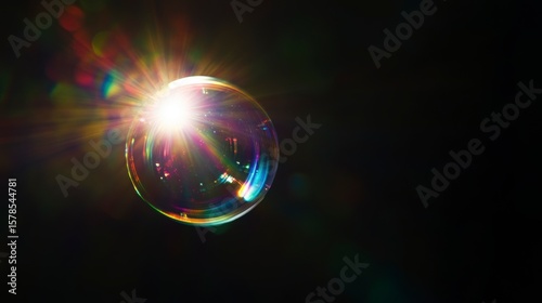A vibrant soap bubble illuminated by a bright light source against a dark background, showcasing iridescent colors and lens flare.