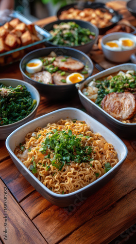 A vibrant spread of delicious Asian cuisine featuring noodles, leafy greens, boiled eggs, and savory sides on a wooden table.